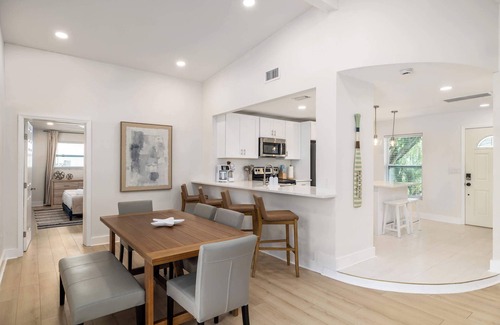Spacious 4BR/4BA coastal oasis in Largo, FL! This stylish waterfront home sleeps 10 and features a private screened pool, modern kitchen, and bright open living spaces. Enjoy outdoor dining, a propane grill, and a small dock for fishing or water sports. Ideal for families or groups, with king beds, bunk room, ensuite baths, and family-friendly extras like a Pack N Play and high chair. Minutes to beaches, dining, and Tampa Bay attractions!