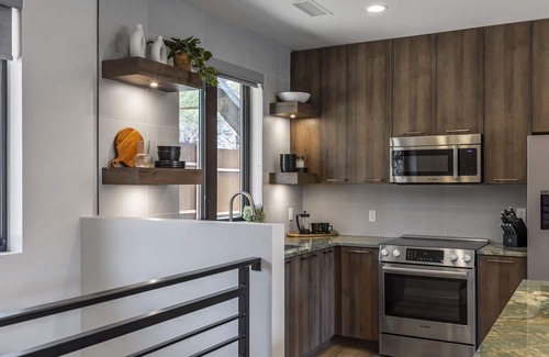 LaFave rental units are very spacious: the average suite size is 1252 sq ft. LaFave units feature modern design and brand-new full-size kitchens with stainless appliances and quartz countertops. The units include a dining table, walk-in tile showers, washer/dryer, private bedrooms, and a living room. Each unit in the complex includes a private patio or deck with stunning views of the soaring red sandstone cliffs of Zion.
