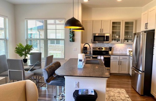 Based in the heart of Grapevine, you're less than a minute from a major highways with easy access to the Grapevine Mall, DFW Airport. restaurants, coffee shops, shopping and entertainment! This Luxury Apt (1129SQft) comes with sleek decor, lush bedding, 600MB High Speed Internet, state-of-the-art gym & a beautiful 3rd story greenbelt view with absolutely. King in master & queen in other room. Workstation, dining area, fully equipped kitchen. IMPORTANT: “OTHER THINGS TO NOTE” ( pets, required ID’s, etc)