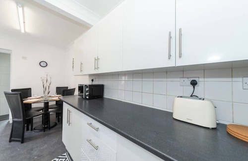 The kitchen is fully equipped with modern appliances, including gas hobs, fridge and freezer, oven, microwave, kettle, and a toaster. You'll find everything you need to prepare and enjoy meals at home. The dining area is ideal for family meals or casual dining.