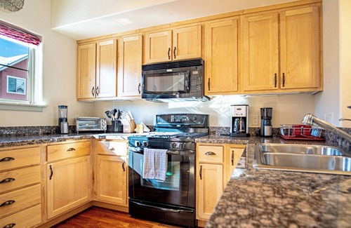 Stay at Sweetwater comfortably accommodates up to 4 guests in two well-appointed queen bedrooms. The primary suite features an ensuite bathroom with double vanities and a walk-in shower, while the second bedroom has convenient access to a hallway bathroom with a tub/shower combo. Enjoy added perks like high-speed WiFi, central A/C, an in-unit washer/dryer, and a heated double garage – making your stay effortless, no matter the season.