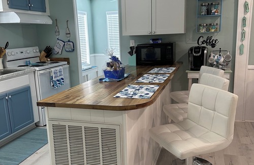 Beautifully updated 2 bedroom (King, Queen) 2 full bath beach house. Sleeps 6. Golf cart included. Open floor plan with separate full size sofa bed. Dining table, breakfast and coffee bar, and fully stocked kitchen. Three smart TVs, WIFI, and Spectrum cable. Linens (sheets, blankets, towels, etc) included, along with washer and dryer. Large deck, spacious carport, and concrete parking pad for three cars.