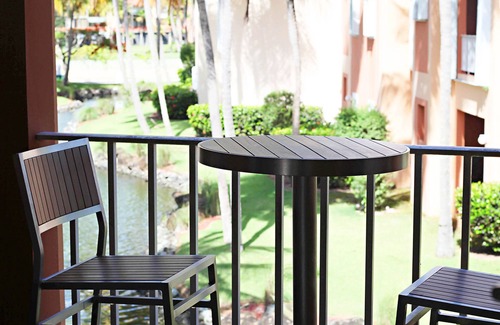 From the balcony you get a serene view of a pond and neatly kept lawn dotted by tall palm trees. The pond has actual real wildlife in it (such as turtles, fish, birds).