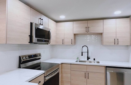 • Kitchen: Newly remodeled kitchen has a large quartz counter with stools and dining table that would fit 4 people comfortably.