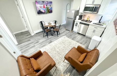 Our cozy two-bedroom studio on Ferry St offers comfort with queen-size beds, a fully equipped kitchen, and a spacious living area. Just minutes from Manhattan, it's ideal for families or groups of up to four people, providing a perfect home away from home.