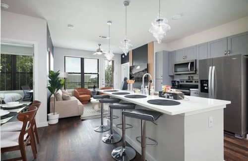 Discover the charm and convenience of The San Antonio Oasis, a contemporary two-bedroom, two-bathroom apartment nestled in the vibrant city of San Antonio. This stylish retreat accommodates up to five guests, offering a perfect blend of comfort and modern amenities. Whether you're here for a family vacation, a business trip, or a quick getaway, The San Antonio Oasis provides everything you need for an unforgettable stay.