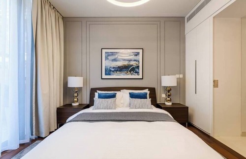 The main bedroom having a king-sized bed, the second bedroom having a queen-sized bed, and the maid’s room with 1 single bed. A fully equipped kitchen, a kitchen counter, and 3 high stool chairs have enough storage, and a guest powder room plus a separate area for laundry is provided.