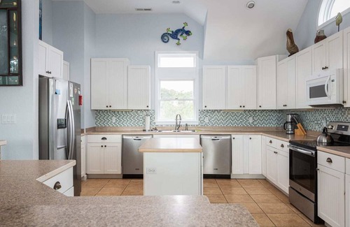 This three-level vacation home is thoughtfully designed to cater to guests of all ages, providing comfort and entertainment throughout.