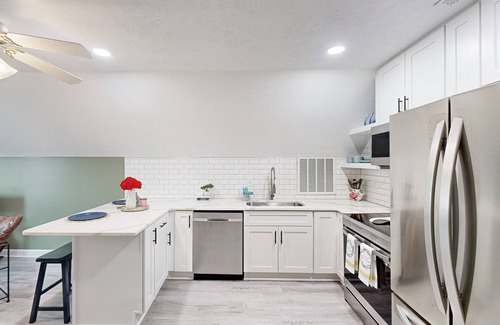 Inside, you'll immediately feel at home amidst the inviting color palette, tasteful decorations, and hardwood flooring. The well-equipped kitchen makes cooking a breeze with its stainless steel appliances and ample meal prep space. You'll love serving up delicious meals to your family at the cozy dining table. A work desk is even available in the bedroom for those working remotely.