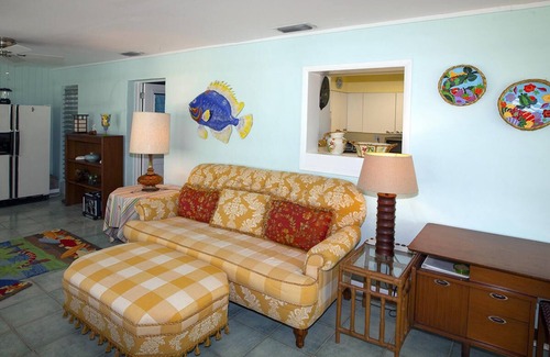 This ground-level three-bedroom two bath home is located on the ocean side of Cudjoe Key with a great deep canal and a marina just around the corner. The home features eclectic and colorful decor with a mix of antiques and Caribbean/Keys colors and art. Inside there is a bright and comfortable living room area with an adjacent dining area as well. There is also a large "Florida Room" which opens out to a huge screened and covered dining/party area.