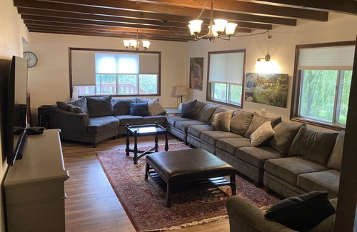 This place just keeps getting better. The newly renovated Red Cub Lodge is bigger, nicer and better than it has ever been before with room for the whole family. Brand new (2025) two story deck. At 1,300 sq ft, the new deck is the biggest and nicest room in the lodge. Space for 48 to dine on the main deck alone. Eight bedrooms, Seven baths. Two enormous Glamping Tents with King Beds. Brand new (Fall of 2024) deck with space for the whole family. Giant (25x50 ft) Warm Spring Fed Pool. Volleyball Court. TWO Competition Horseshoe Pits. Game Room. New Air Conditioning (Spring of 2024), and a GIANT (54cf) commercial fridge/freezer.... Oh yeah, did I mention the giant private pool and TWO hot tubs. This 4500 Sq Ft home on 2.7 acres. on the banks of the Cub River Sleeps @50.