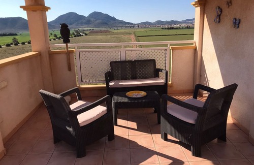 Penthouse Apartment, splendid views over farmland, regular visits from the shepherd with his sheep, goats and dogs. Faces south to make the most of the Spanish sunshine. This area boasts 315 sunny days a year. To me a sea view is from the balcony where you mainly sit or the lounge, so to me I wouldn't advertise a sea view but you can see the sea from the roof terrace and from the kitchen window through the apartments. 3 twin bedrooms so suitable for families, friends and golfers. English TV, DVD Player, free 300 wi-fi. Fully equipped kitchen, lounge with direct access to balcony for easy outdoor dining. Beautiful sunsets. Further private large roof solarium with brick built bbq for more outdoor dining or soaking up the sun, four sun loungers, chairs and coffee table, for relaxing and enjoying the view. Full air conditioning. Apartment all on one level. There is a communal pool area with a smaller pool for children. The sandy beach great for children only 10 minutes walk away, shallow and warmer than the Med, with beach bars, one with internet access, Italian restaurant, marina and tennis club. Sailing, kayaking, pedalos in peak season. A supermarket, ten minute walk. The La Manga Strip is ten minutes drive with bars and restaurants and excellent for water sports. The La Manga club is a ten minute drive with 3 championship golf courses, bowls and tennis, also a spa. It also has restaurants and nightclub. The whole area is a haven for sport, especially water sports, golf and tennis. Fabulous mini golf for adults and children, ten minute drive. Excellent historic interest, especially Cartagena, 20 minutes drive away. Lovely diving/fishing port at Cabo, great restaurants there to on waters edge. The airport of Murcia is 20 kilometres away. Alicante is about an hour and a quarter and has many more flights from most European countries