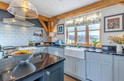Bathroom: Roll Top Bath With Shower Over, Heated Towel Rail, Toilet. Electric, Air source heat pump and underfloor heating, gas, electricity, bed linen, towels, Wi-Fi and fuel for wood burner included. Welcome pack. Enclosed front and rear gardens with patio, courtyard and garden furniture. Bike store. Private parking for 4 cars. No smoking. . Chestnut Cottage has been lovingly converted into a destination holiday cottage in the beautiful village of Sheinton, where gorgeous interiors and rustic, bespoke furniture await you and your guests. As you enter through the bespoke oak doorway, you’ll find yourself in a bright and spacious porch, great to take a seat and remove your boots and coats. A large sofa is set around a welcoming wood burner in the living room and provides the ideal spot to gather to plan your next day’s adventures or just relax with a film on the Smart TV including Netflix and Freeview. The adjacent kitchen is kitted out for creating feasts with all the appliances you will need and follows a very contemporary design. The French doors in the dining area lead out to the garden providing loads of natural light and stunning views of the Wenlock Edge and further towards the Welsh hills; a lovely sociable space to enjoy evenings over a delicious meal or maybe some board games and drinks.