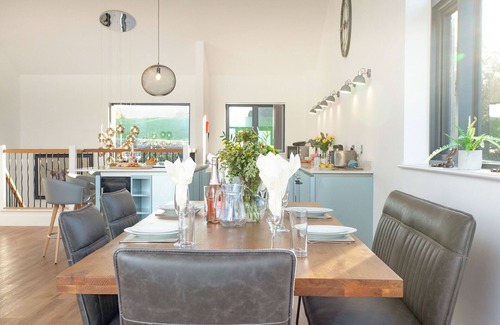Kitchen area: Electric Oven, Electric Hob, Microwave, Fridge/Freezer, Dishwasher, Washing Machine, French Doors Leading To Balcony. Air source heat pump central heating, electricity, bed linen, towels and Wi-Fi included. Travel cot, highchair and stairgates available on request. Welcome pack. Garden with patio and garden furniture. Enclosed front garden with sitting-out area, garden furniture and barbecue. Hot tub for 6 (private). One well behaved dog welcome. Bike racks. Electric car charging point (shared with other properties on-site, at cost). Private parking for 3 cars. No smoking.. Nestled at the foot of the Quantock Hills (England’s first designated Area of Outstanding Natural Beauty), Bincombe Country Cottages are located outside the small hamlet of Over Stowey near Bridgwater in Somerset. The site comprises of four luxurious holiday homes newly built in 2021; two end terrace three-bedroom properties and two mid-terrace two-bedroom properties. These exceptionally stylish terraced properties are ideally located for enjoying superb walking in the peaceful countryside of the Quantock Hills and they each showcase a private front and back garden with a hot tub, a balcony, underfloor heating throughout, free parking and reverse-style living making the most of the views of the north Somerset coast in the distance and you can even see Glastonbury Tor on the horizon on a clear day.