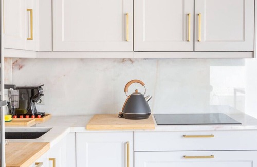 The bright and spacious living area is ideal for relaxing after a day of exploring, with a cozy sofa, large wall art display, and a Smart TV. The fully equipped kitchen includes everything from an oven and stovetop to a microwave, toaster, fridge/freezer, and a coffee machine, making it easy to enjoy home-cooked meals or a quick morning espresso.