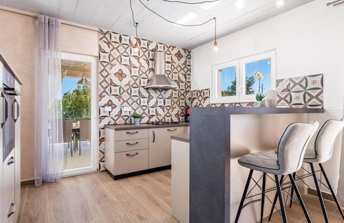 Upstairs it has 3 bedrooms which include three double beds (180x200) and 3 bathrooms with showers. On the ground floor of the villa there is a living room which contains a sofa, a two-seater, an armchair and a TV. The beautifully decorated kitchen has everything you need to prepare your favourite and most delicious dishes, such as cooking utensils, oven, toaster, coffee maker and wine fridge. Also, part of the kitchen is a small bar with 2 seats. Near the kitchen is a dining room with a table with 6 seats, and next to it is an exit to the outdoor terrace.