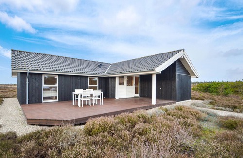This beautiful vacation home is located at the end of a child-friendly cul-de-sac in Kongsmark. From one terrace you have a unique view over the heath area. Via Småfolksvej you come to the beach of Lakolk, Northern Europe's widest sandy beach. The beach is accessible by car all the way down to the shore of the North Sea. The homeowner has placed emphasis on functional equipment and physical activity has also been taken care of. The activity room has a table tennis table. Lovely bedrooms and pretty bathrooms. Many beautiful bike paths. Use of the indoor pool and its sports and fitness facilities is included in the rent.