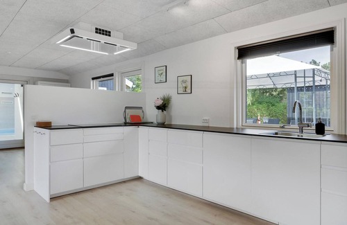 The decor is bright, modern and not least spacious and the whole family can snuggle up in the large sofa, which is located by the wood stove and large TV. Outside you will find a beautiful wooden terrace with dining area and sun loungers.