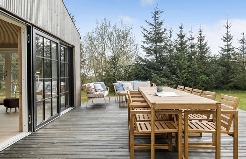 Enjoy a relaxing and exciting family vacation in your vacation home at Hou Strand on Aalborg Bay. It offers all the amenities you need for a comfortable stay and invites you to spend unforgettable moments with your loved ones. The open-plan living and dining area is the heart of the house and invites you to socialize. Dine together at one of the large dining tables, either in the living area or on the spacious terrace under the open sky. In the evening, the wood-burning stove makes for cozy evenings. Enjoy your free time to the full and play a game of billiards with the whole family.