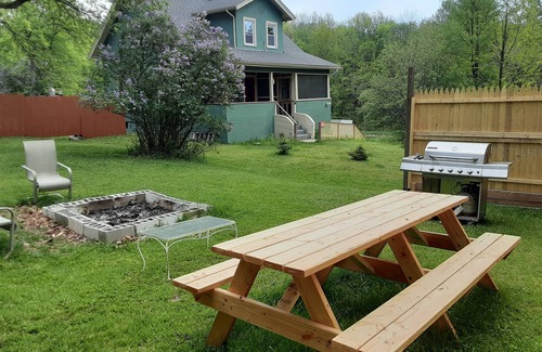2.5 bathrooms, WiFi internet and tv, owner lives up the street and is usually available, kitchen is fully furnished, 15 acre property is a small working farm growing garlic, horseradish, small orchard, etc. Pond and barn on property. Home has full-size washer and dryer in basement, also baby grand piano not very well tuned at this time. Fire pit, bbq grill, picnic area exclusive to each house.