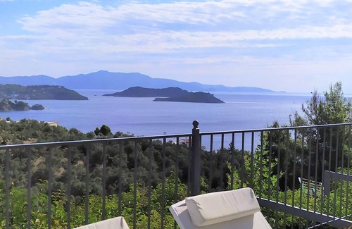 The villa consists of three bedrooms with double queen's beds each, plus two very modern and fully equipped bathrooms.On the 45 sqm wooden deck the pool plus a kiosk and dining facilities, are nested.Up to seven people can sleep.The whole place has stunning sea views. A charming environment awaits and promises you unforgettable moments of calmness and relaxation, as despite it stands alone on the top of Katsarou hill, at the same time is very close to Skiathos town