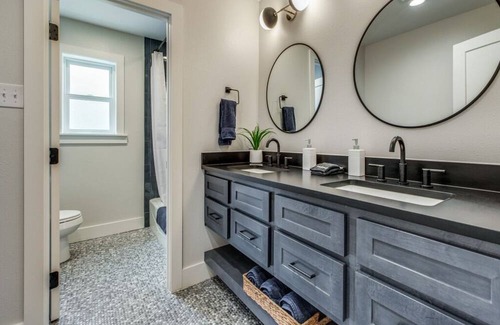 The West Side of Home includes a primary suite with spa like bath: walk-in shower, dual shower heads, double vanities, sitting area and workspace. Three secondary bedrooms: two bedrooms with queens, one with pair of twins are adjacent to the primary suite. The oversized hall bath with double vanities is adjacent to these bedrooms.