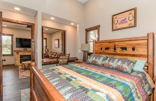 Black Prong Equestrian Village is a 90-acre resort with cottages and cobblestone RV pads nestled in the 53,000-acre Goethe State Forest with its 100s of miles of biking and horseback riding trails. This one-bedroom cottage is situated alongside the main turf arena. This cottage has a strong log cabin motif with its log furniture and natural hickory cabinetry. Its smaller 1-bedroom layout features a kitchen with a sitting bar, a spacious living room, and a bedroom with a queen size bed and a built-in desk. The bathroom has a tiled walk-in shower and a stacked washer and dryer. Attached to the cottage are 4 stalls that can be rented separately and a large climate-controlled tack room. Amenities include a heated pool and hot tub, fitness center, bicycles, and more.