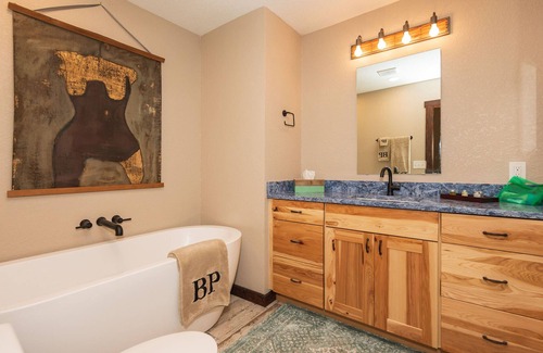 This is our most secluded cottage, located on the south end of the property. This cabin feel cottage features a lovely kitchen with all state-of-the-art appliances, a great living room and dining room. The bedroom has a log king size bed with a large walk-in closet, and the bathroom features a free-standing soaking tub, a walk-in tile shower and a full-size washer and dryer. Attached are 5 stalls and a large climate-controlled tack room. It is at a very close proximity of the Goethe trails exit and is overlooking our future covered arena.