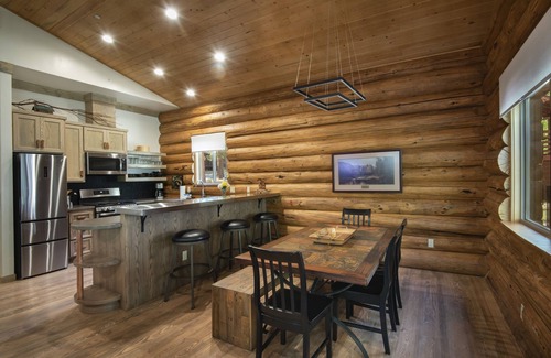 The Mini Cabin is a beautifully, hand-crafted, authentic full-log interior and exterior cabin with a stylish blend of mountain modern and vintage decor. The owner completely rebuilt The Mini Cabin in 2019, keeping its charm and history as one of Wawona's original log cabins, but now with contemporary amenities. The great room is spacious and comfortable, combining the living, dining, and kitchen areas for family and friend gatherings. The kitchen is well-appointed with high-performance appliances and boasts a breakfast bar for optional seating.