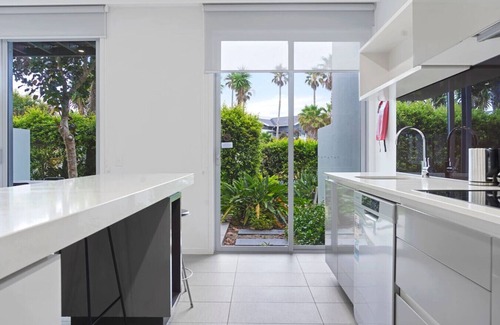 The sleek, modern kitchen is fully equipped with top-tier appliances, ample counter space, and all the cookware you need to prepare your favourite meals.