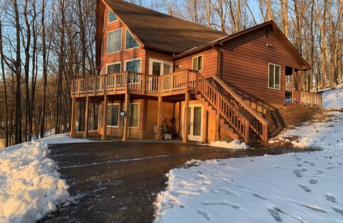 Comfortable large modern chalet surrounded by mature trees close to Appalachian Trail. Gas fireplace (operational in winter months) in living room. Principal Bedroom (loft) with Queen Bed, walk-in closet, en-suite bath/hot tub. Two additional guest bedrooms. Lower level has double Jacuzzi whirlpool, TV den, laundry room and home office (bring your laptop, WiFi included for a fee). Wildlife, including deer, raccoons, turtles, snakes and (sometimes black bears) wander through our community and guests assume all responsibility and liability for their interactions with wildlife (also beware ticks and mosquitos - liberal use of insect repellent is suggested). Pool and tennis court on premises (pool open Memorial Day to Labor Day). New Trex decks in front and back, in 2020. Gorgeous mountain views. NO grilling or cooking outdoors; no parties, unregistered overnight guests or fire pits; animals and minors are not accommodated in this property. The house is not handicapped accessible because of stairs outside the entrances and some narrow doorways. Please inquire before booking. We are happy to answer your questions.