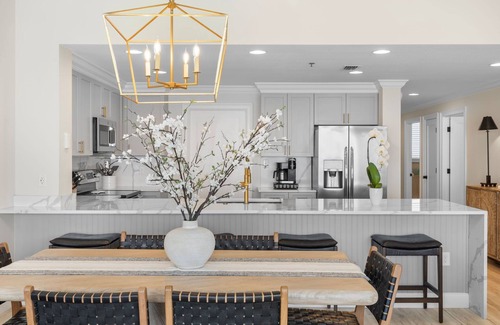 Inside, the interiors are airy and sophisticated, with a modern coastal palette and thoughtfully selected finishes throughout. The fully equipped kitchen features sleek marble countertops, stainless steel appliances, and all the essentials needed to prepare a gourmet meal. The dining area offers seating for six, while the adjacent living room invites relaxation with plush furnishings and a large smart TV—ideal for quiet mornings or winding down after a day by the water. From the living room, sliding glass doors open to a furnished, private balcony overlooking the emerald waters and sugar-white sands of the Gulf.
