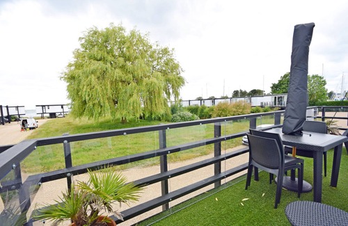 The accommodation is on raised level with all living space on the first floor. Walking up the stairs into the living room you can enjoy the sea views across pond to the water, the large French doors open onto the balcony with a comfortable seating area ideal for enjoying a glass of wine on a summers evening or snuggled under a rug on the colder autumn nights.