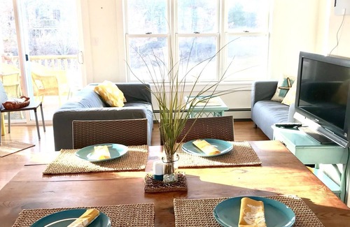 Just a few minutes walk to two beaches (3/10 of a mile) and Onset village with great restaurants and attractions. You can kayak right from our backyard. Kayaks provided! We have a hot outdoor shower. Outdoor dining and a large BBQ make summer nights perfect outside watching he sun go down. Fire-pit for smores.