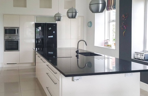 Kitchen/dining room: With wood burner, breakfast bar, electric oven, electric hob, microwave, fridge, freezer and dishwasher.