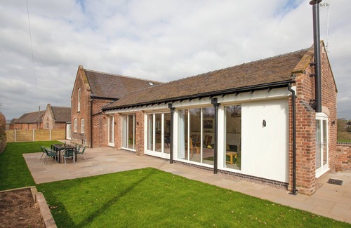 Separate Toilet.. Ground source heat pump underfloor central heating, electricity, bed linen, towels and superfast fibre broadband included. Travel cot and highchair. Welcome pack and doggy extras. Enclosed lawned courtyard with terrace, garden furniture and gas BBQ. Private parking for 4 cars. No smoking or e-cigarettes. Please note: There are 2 internal steps and 1 step to the garden (ramp available on request). There is a fenced pond in the grounds, 50 yards away.. Offering beautiful, far reaching countryside views over magnificent Staffordshire countryside, The Cartshed is in a truly rural location on the site of a working farm, near the small hamlet of Slindon. This wonderful barn conversion was completed in 2018, and the property benefits from full underfloor heating and is spread out over one level with just a couple of steps down to three of the four bedrooms. The spacious living/dining room makes a fabulous social area with a wood burner as a focal point - perfect for cosy winter months. During the summer, throw open the bi-folding doors onto the enclosed terrace, sit back and relax, and enjoy the outside space.