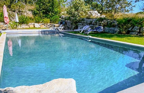In the countryside, surrounded by vineyards, lies this beautiful, modern vacation home with its pretty, large private pool, which is extended by a delightful summer kitchen. You can also take a stroll in the large, romantic and bucolic park with large, old trees, which has a lovely terrace with natural shade where you can spend some quiet time with a book.