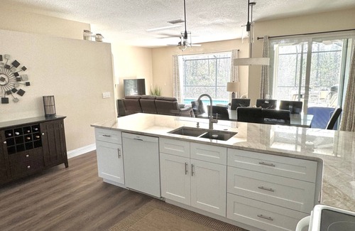 Be our Guest at our 'Home away from Home'. Loaded with upgrades our 4 bedroom, two bath, home with private screened in pool offers granite counter tops in the kitchen and baths, travertine tile in the baths, and new furniture in the family room. Cable TV in all the bedrooms and living room. The master suite has a king- size bed, second bedroom has a queen, and the third and fourth bedrooms have two twin beds each, For additional family fun, enjoy our game room, equipped with a full size pool table, Foosball table, and air hockey. We also have wireless Internet service. Enjoy the south facing screened in pool and lanai area, offering a peaceful and private view of the conservation area in our back yard. Full service kitchen and gas grill for outdoor grilling, plus a washer and dryer.