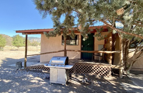 This unique newly remodeled one-room stucco casita is surrounded by the Gila Wilderness. This ADA unit contains one room with one queen-size bed and one twin-size bed and has a full-size ADA bathroom with a tub/shower combination. Your kitchen has a refrigerator, stove, microwave, and coffeepot. It comes equipped with dishes, pots and pans, coffee, cream and sugar, and a few basic spices. Your casita is tastefully furnished with artwork depicting the local area.