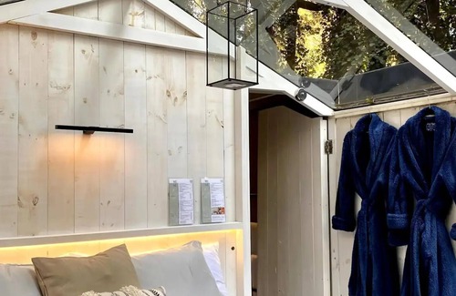 live the experience in a glass cabin for people who like to relax in the middle of nature without having to leave the city at 5min Santa Fe. 9m2 cabana private bathroom, smart tv wifi, private Jacuzzi, shampoo, 2 towels, coats and mask. The cabin is located in a space of 500m2 where there are other cabins which share common areas: campfire, projector garden rooms and dining rooms. extra sauna/decoration