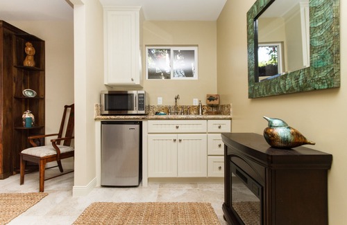There is a king bed (can be made up as 2 twins upon request) in one bedroom. The second bedroom has a queen murphy bed, kitchenette and seating. It has a sliding door opening to rear patio table and gas barbeque.