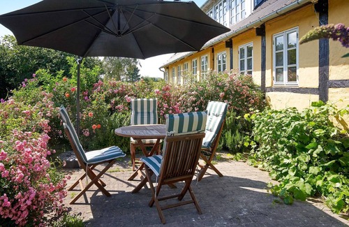 Holiday apartment located in the eastern part of the main building on a country estate in Østermarie. The apartment contains an entrance hall, large kitchen with dining area and exit to the terrace overlooking the garden that goes down to the creek. Owner lives in the other part of the main building. The dining kitchen and living room are separated by beautiful French doors. The living room has a wood burning stove, a cozy sofa arrangement and a double bed. Dining kitchen and living room face south. To the north is the bathroom and bedroom with double bed. The holiday apartment is located in beautiful rural surroundings. Owner's horses walk on the loops around the property. The large garden is the owner's, but can be used by agreement with the owner. Not for rent to youth groups.