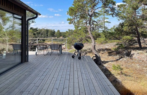 Welcome to this fantastic cabin built in 2023, set in a magical environment on Väddö in Norrtälje, just a stone's throw from the sea. The property features a wood-fired hot tub, sauna, and beautiful views of the sea in multiple directions! Open social spaces with generous ceiling height and a cozy sleeping loft. Large windows that resemble a painting, creating a peaceful harmony between the indoors and outdoors. Start your day with a dip from the cliffs into the sea, or why not a warm bath in the hot tub or sauna to the sound of nature. This is a place designed for relaxation and for those who seek something extra special! You are welcomed by a beautiful cabin on a hill with a generous wooden deck offering various "rooms" and breathtaking views of the archipelago. Inside, the kitchen, dining area, and living room come together in an open space with stunning views of the sea and untouched nature. The small kitchen allows you to cook while gazing out at the sea, equipped with two induction hobs, a combined oven/microwave, coffee maker, and other essentials. The kitchen opens up to the living area and dining table. Here, you can listen to music via Sonos AirPlay. Further in, you'll find a comfortable bedroom with a double bed for two (140 cm wide) and a smart TV. The bedroom has its own door leading directly to the wood-fired hot tub, which also features a bubble function. On the ground floor, there's a stylish bathroom with a shower, toilet, and sink. There are two additional sleeping spaces in the cozy loft, which you reach via a ladder. The ladder is somewhat steep and lacks a handrail, so please be careful. The loft has limited headroom but is very comfortable for sleeping. A large terrace surrounds the entire house, complete with a lounge area where you can watch the sunset, a dining table for enjoyable dinners, a charcoal grill, and sun loungers by the hot tub and sauna. The sauna is accessible from the outside next to the hot tub, and both the hot tub and sauna are wood-fired. There's also an outdoor shower with hot water for those who want to enjoy a refreshing shower in the open air while listening to the birdsong! Good to know! The owner has a summer house next to the cabin and is occasionally there, but most of your outdoor space is secluded with views of the sea. The owner also has a charging station for electric cars via Wallbox, which you can use, but you will need to pay for the actual consumption on-site. There is also a basketball court that you pass when driving to the house, and you're welcome to use it! Just a stone's throw away, you can enjoy a secluded swim in the sea from the cliffs, where you can also fish. If you prefer a sandy beach, Sandvikens camping is about 1 km away. There is much to explore on Väddö—take a trip to Gamla Grisslehamn or Gåsvik for fine design from Edblad, have a coffee at Kröns Trädgård, or enjoy a delicious meal at Ankaret or Bonden och Burgaren. The list goes on—welcome to Roslagen and the Stockholm Archipelago!