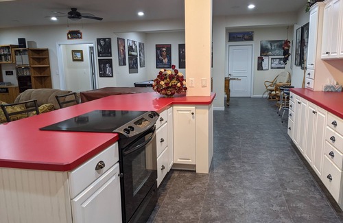 The large fully equipped upper and lower kitchens offer 2 full size fridges, cooktops, microwaves, dishwasher with plenty of cabinets filled with all types of dishes, cooking/baking utensils and small appliances. Guests will tend to move items from one kitchen to the other but both are fully equipped. You can cook in luxury while staying in the middle of the action with the open concept set up of both kitchens. Living areas with Comfy Reclining sofas, Smart TVs and fast speed wireless internet and a huge video library for rainy days. Pool table, foosball table, hockey table and board games available to keep everyone entertained. The cell phone coverage is spotty in the area depending on your service provider.