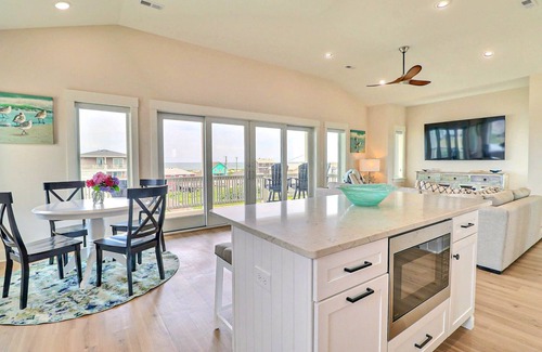 Take the elevator to the top level and the first thing you'll notice are the sliding glass doors leading out onto the Covered Porch where you can take in an irresistible view of the ocean. Comfortable deck furniture makes this the ideal place to relax with your morning coffee to watch the sunrise or enjoy an evening meal outside. The Main Living Area boasts a cozy couch and 75” Flat Screen TV for movie night. Just across from the living area, the modernized Kitchen with Flat Top Stove and stainless steel appliances means that your homemade seafood masterpiece is just a few steps away. Enjoy your scrumptious meal at the Breakfast Bar or connected Dining Area.