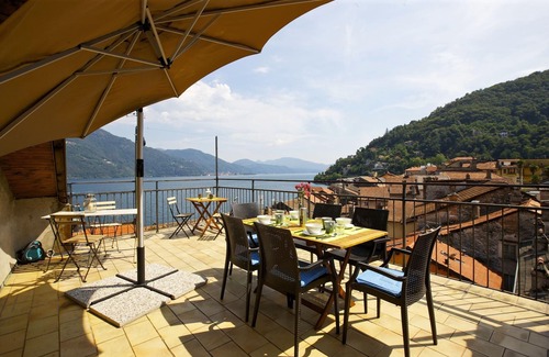 The tastefully furnished 4½-room corner duplex is located on the third and fourth floor (= top floor) of a 3-family house from the 18th Century in the heart of the picturesque old town of Cannobio with its typical houses and narrow streets. Only about 30 meters away is the romantic lakeside promenade and the piazza with harbor. Shops, cafes, bars and restaurants are also within walking distance. It is a beautiful, partially renovated approx. 130 m² large 4½-room corner maisonette, which has retained the charm of an antique apartment. The combination of modern and antique has succeeded here. At this retreat, you can simply dive from everyday life and enjoy all the things that make the Italian way of life so adorable. Of great recreational value are in addition to the three balconies, the approximately 30 m², sunny roof terrace all day with 360 ° views of the lake, the mountains and the roofs of Cannobio. The central yet quiet location offers many opportunities to spend a varied holiday without a car. The public beach is just as easily accessible on foot as the pier of the passenger ferry. From here you can explore the lake by boat and make various trips to the famous Borromean Islands. On the public beach with its spacious lawn (lawn and sand) there is a sailing and surfing school for water sports, where pedal boats and sailboats or surfboards can be borrowed. If, despite everything, you feel the longing for the rest of the world, you have free wireless internet access to navigate the Internet. Approximately 300 meters from the apartment there are free public parking spaces. A ground floor cellar can be used to store bicycles, strollers or water sports equipment. Pets are not allowed. Apartment layout: Basement on the ground floor: Approx. 30 m² basement on the ground floor, z. B. suitable for bicycles or strollers. 1 Level: Entrance lounge with original belt floor, satellite TV, pull-out sofa bed for 2 persons (1.60 mx 2.00 m) and exit to the approximately 8 m² long oblong balcony with stunning views of the lake, the mountains and the roofs from Cannobio Separate, well-equipped kitchen with dishwasher, microwave and oven and exit to the approximately 4 m² long balcony with stunning views of the lake, the mountains and the roofs of Cannobio Dining room with lake view Storage room with washing machine Bedroom with double bed (mattress : 1.60 mx 2.00 m) and exit onto the approx. 6 m² long oblong balcony with marvelous view the mountains and the roofs of Cannobio Friendly bathroom with bidet, bath (shower possibility) and window with view on the roofs of Cannobio 2 , Level (garret with sloping ceilings): 2. Bedroom with exposed wooden beams, satellite TV, double bed (1.60 mx 2.00 m) and exit to the roof terrace. 30 m² sunny roof terrace with 360 ° view of the lake, the mountains and the roofs of Cannobio. A large retractable umbrella provides shade over dining table or loungers
