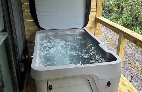 Step inside and discover a simple one room cabin with modern finishes and everything you need for a comfortable adventure. A queen-sized bed accommodates 1 or 2 guests. A mini fridge, single induction burner for cooking, basic pots and pans, lightweight dishes, and Keurig allow for light meal preparation inside the cabin. A smart TV is provided for guests to utilize their own streaming accounts, but with the river outside you probably won't want to turn it on! The covered porch overlooking the river is an ideal spot to sip morning coffee, enjoy the sights and sounds of the river, or soak in the private hot tub.