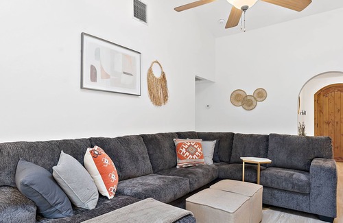Experience this desert resort, a 4-bedroom, 3-bathroom vacation haven in Mesa, Arizona. Enjoy a fully-equipped kitchen, desk space, and spacious living room with a 75" HD Roku Smart TV and stylish mid-mod boho design. Each uniquely-themed bedroom features cozy beds, TVs, and USB lamps. Unwind in the boho-style family room, complete with drink cart and JBL speaker. The picturesque backyard offers a non-heated pool, dining for six, patio furniture, sun loungers, and a shaded area with fans.