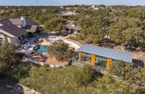 The Rustic Dripping Springs Retreat is a spacious resort-style getaway in in Dripping Springs, Texas. At this 5-acre hilltop oasis, you’ll enjoy a sparkling pool, hot tub, casita, detached office / gym, and beautiful views of the surrounding hill country!