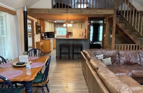 On the main floor is a large family room with a comfy sectional and plenty of extra seating, fireplace, dining area, cute, well stocked kitchen and a large master bedroom with a rustic, hand crafted, king size log bed. Upstairs is a loft with a full size bed which kids will love. Downstairs are three extra full size beds, and a half bath. An exterior door allows for easy access. Beautiful new deck with patio furniture and grill is perfect for experiencing the outdoors while you dine. The national forest is right outside the front door and allows instant hours of hiking. Wildlife abounds in this area and is often seen right out the kitchen or bedroom windows. Our cabin includes wireless wifi, two roku tvs, lots of board games, puzzles and books. Please note .. as with most cabins in these areas, there are steep stairs to the loft and also to the downstairs bunk room, which is where the extra beds are. Just fyi- in case youre unable to handle stairs. Also FYI..We have outdoor security cameras for our use to keep an eye on our property.